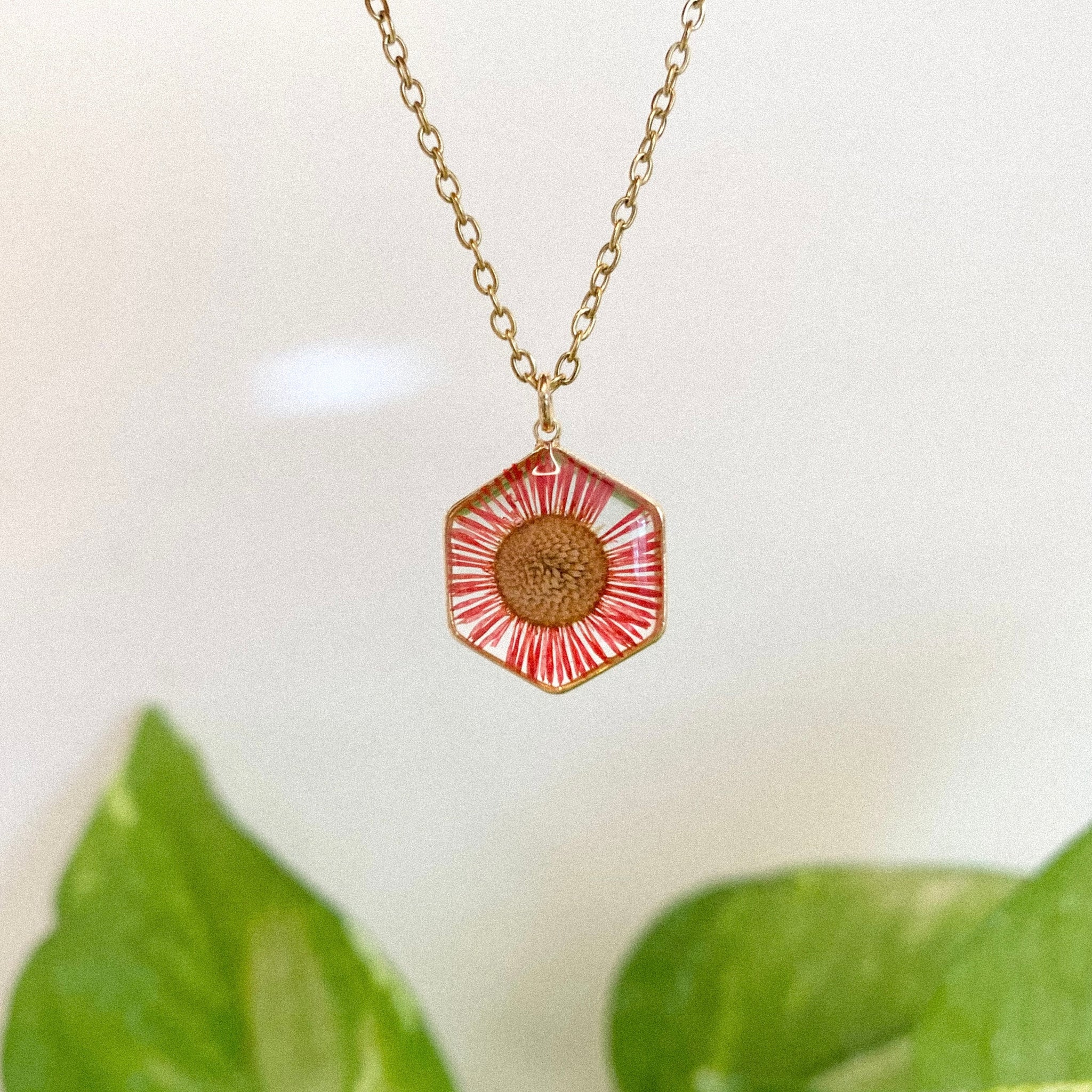 Cada collar está hecho a mano con flores reales preservadas en resina, conservando su forma, color y textura como pequeños fragmentos de naturaleza convertidos en joya. Cada pieza es delicada, liviana y pensada para acompañarte en tu día a día o en momentos especiales.