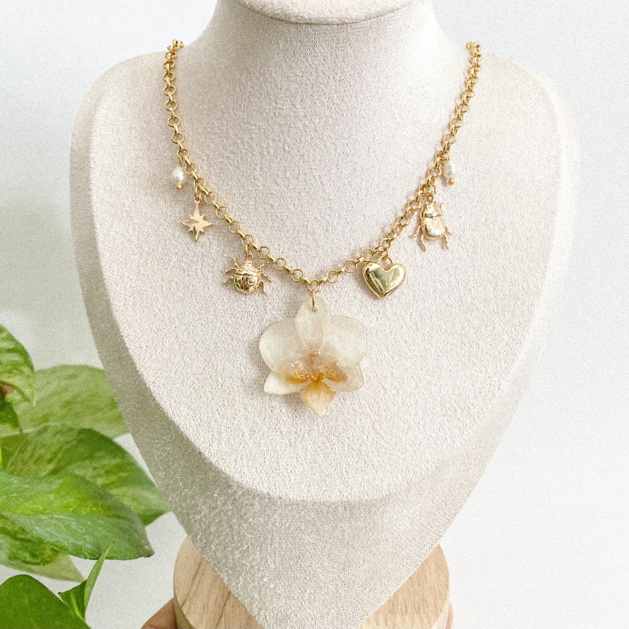 Materials: dried orchid , resin , gold filled charms , 24k shiny gold necklace chain