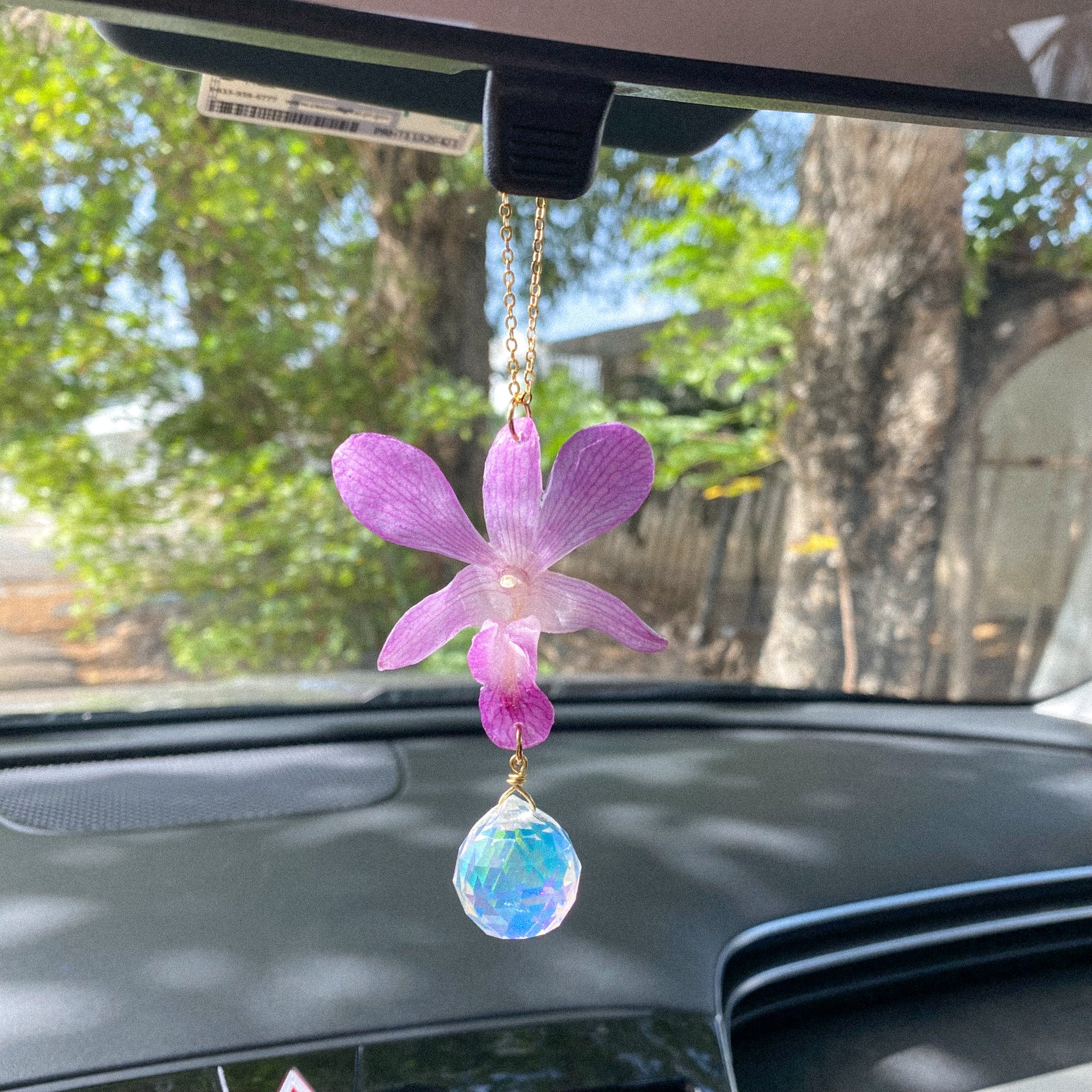 MATERIALS: glass teardrop crystal prism , real pressed orchid flower , resin , shiny gold plated chain with clasp for easy on/off around your rear view mirror