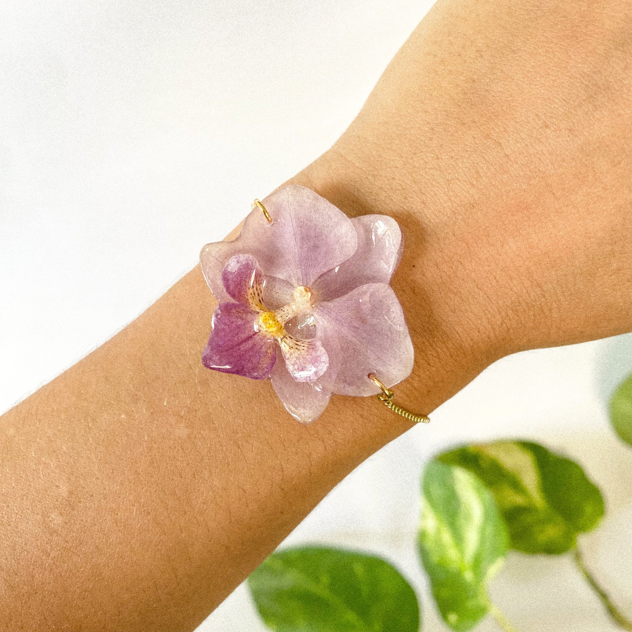 Materials: resin, orchid , sliding adjustable gold plated chain brass bracelet